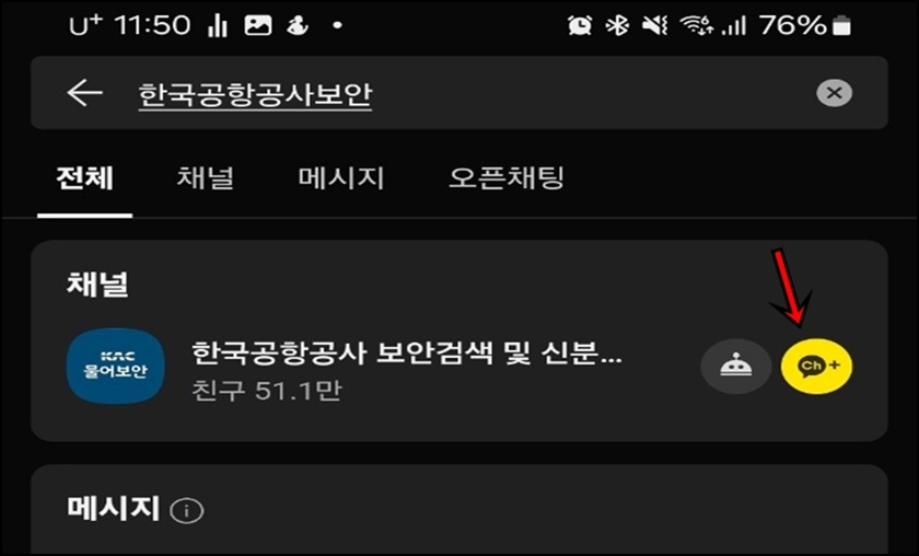 검색창에 "한국공항항공사보안"이라고 검색하시면 채널을 확인할 수 있는데, ch+ 메뉴를 클릭해 주세요.