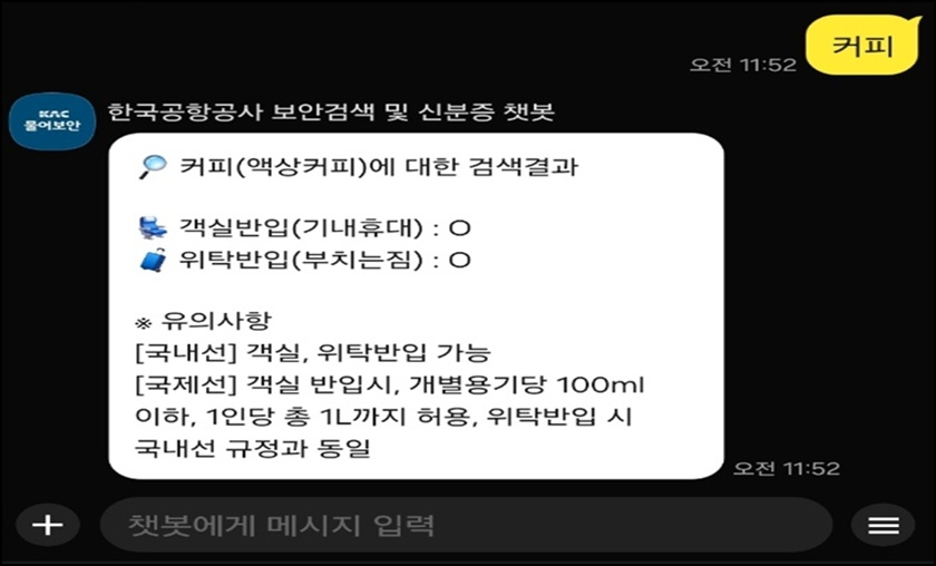 한국공항공사 보안검색 및 신분증 챗봇과 대화가 가능한데, 여기 검색창에 여러분이 기내반입하려는 물품을 검색해 보시면 위 사진처럼 반입 가능여부와 유의사항등을 확인할 수 있어요. 신기하죠? 간혹 커피 음료는 기내 반입이 안된다고 생각하는 분들이 계시는데, 국내선의 경우 객실, 위탁반입이 가능하고, 국제선의 경우 객실반입시는 개별용기당 100ml이하 1인당 총 1L까지 허용되고 위탁반입시에는 국내선과 동일해요.