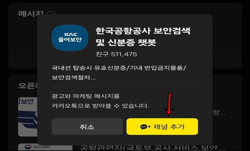 "한국공항공사 보안검색 및 신분증 챗봇" 채널을 추가해 주세요.
