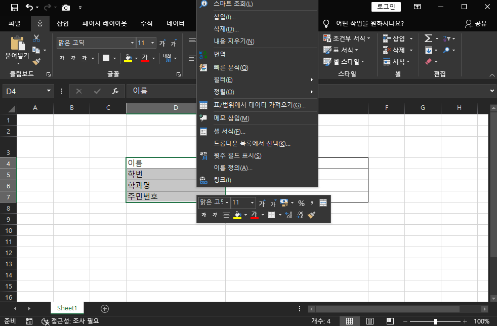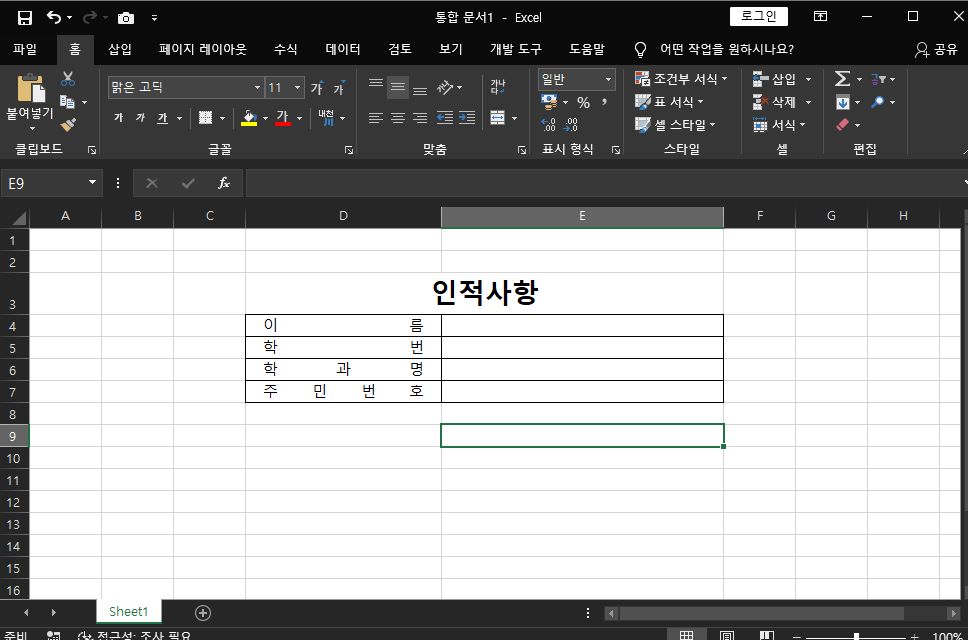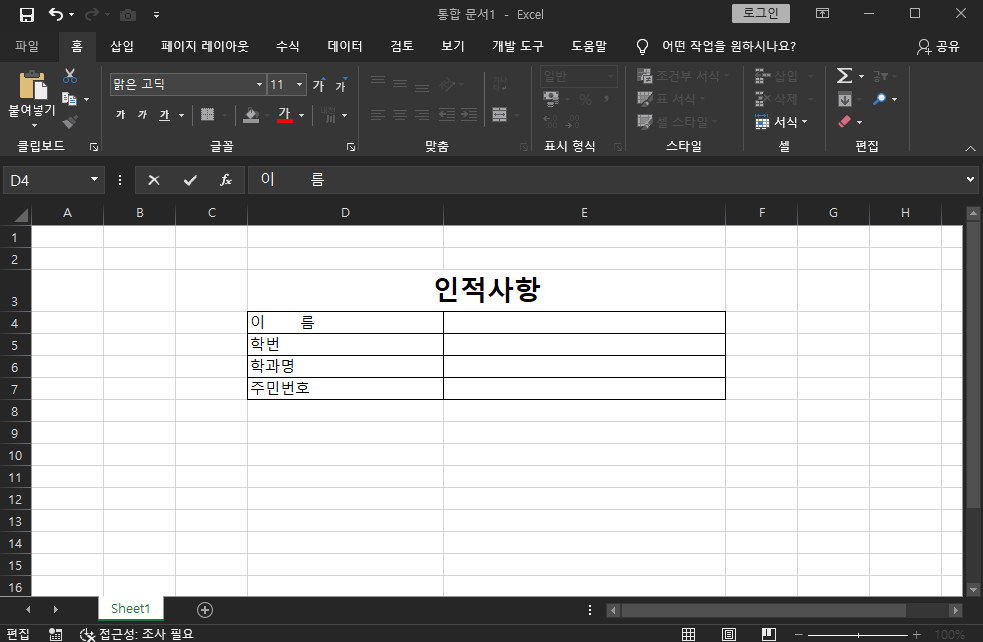 위와 같이 엑셀로 문서를 만든다고 가정해 볼게요. "이름, 학번, 학과명, 주민번호"의 텍스트를 셀에서 균등하게 분할하려고 하면 스페이스바를 이용하실 것 같은데, 이걸 각 셀에 텍스트를 균등하게 분할해 보도록 할게요.