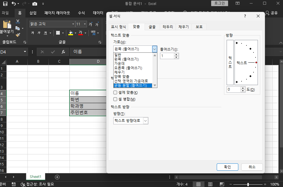 그러면 위와 같이 셀안에 텍스트가 균등하게 분할이 돼요. 참 쉽죠?