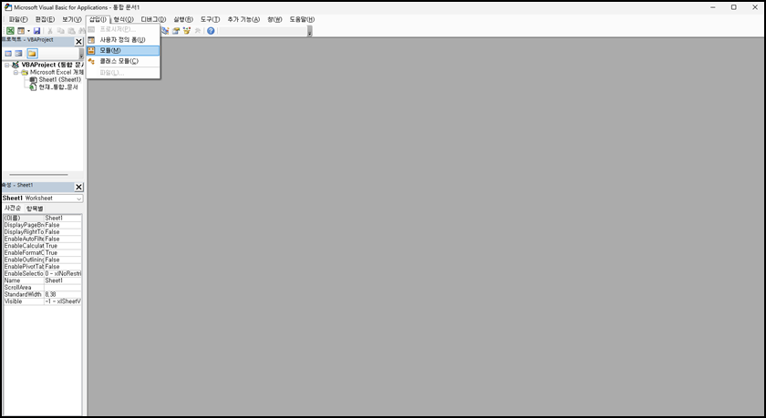 이제 키보드에서 Alt + F11을 클릭하여 VBA창을 열고 삽입 -> 모듈을 클릭해 주세요.