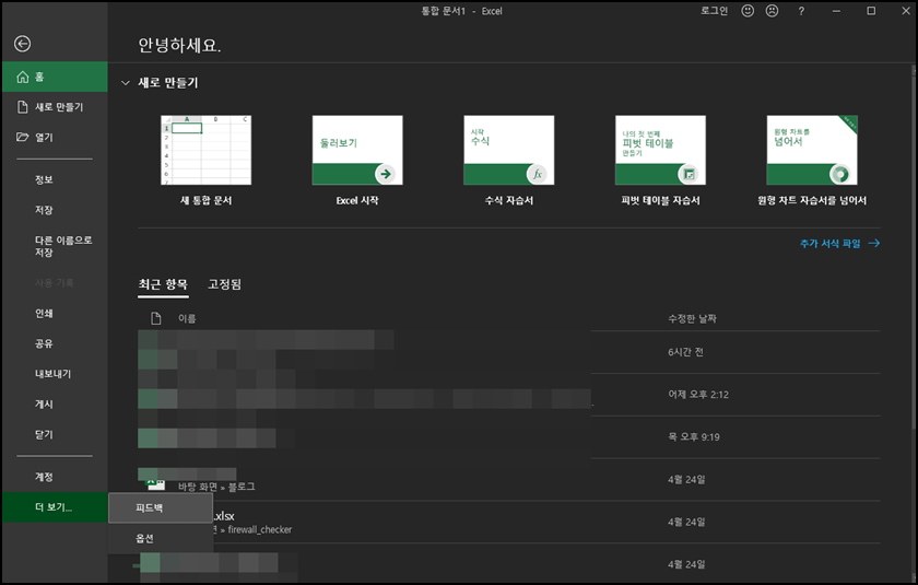 사전 준비로 매크로 사용 설정을 해줘야 해요. VBA를 사용하기 위해 먼저 매크로 기능을 활성화해야 하는데, 엑셀을 실행 후 상단의 파일 -> 더 보기 -> 옵션을 클릭해 주세요.
