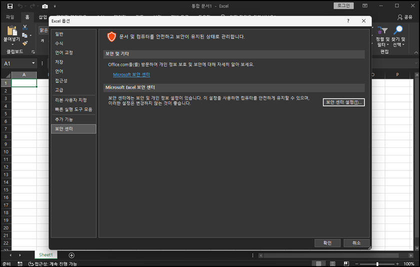 Excel 옵션 창이 활성화되면 "보안 센터'메뉴를 클릭해 주세요.