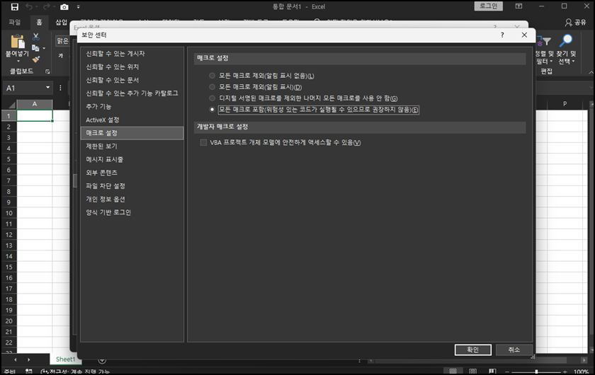 매크로 설정 탭을 클릭 후 "모든 매크로포함"을 체크 및 확인버튼을 클릭하고 엑셀을 다시 시작해 주시면 사전준비가 완료가 돼요.