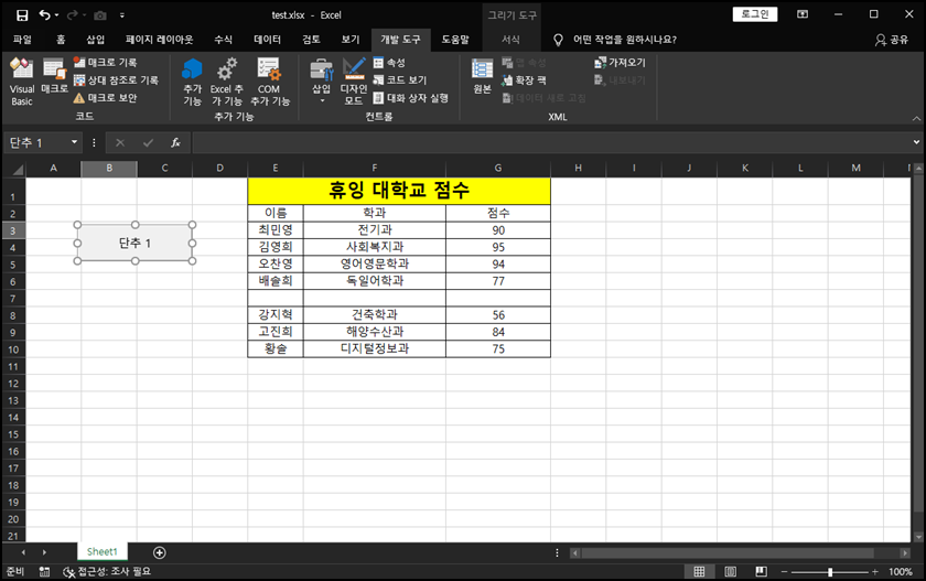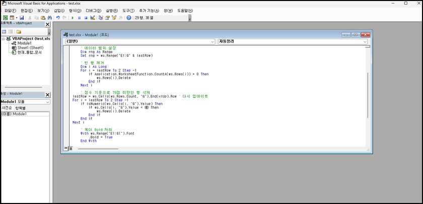 그렇다면 여기서 만약 특정 점수 이상만 필터링하고 싶을 수도 있잖아요? 그럴 때 간단히 VBA코드에 조건문을 추가해서 해당 점수 미만의 행을 삭제할 수도 있어요.