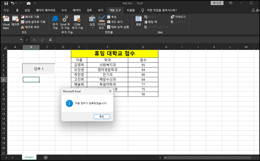"자동 정리가 완료되었습니다"라고 창이 뜨며 빈셀을 제거가 되고 점수 List가 정렬이 돼요. 깔끔하죠?