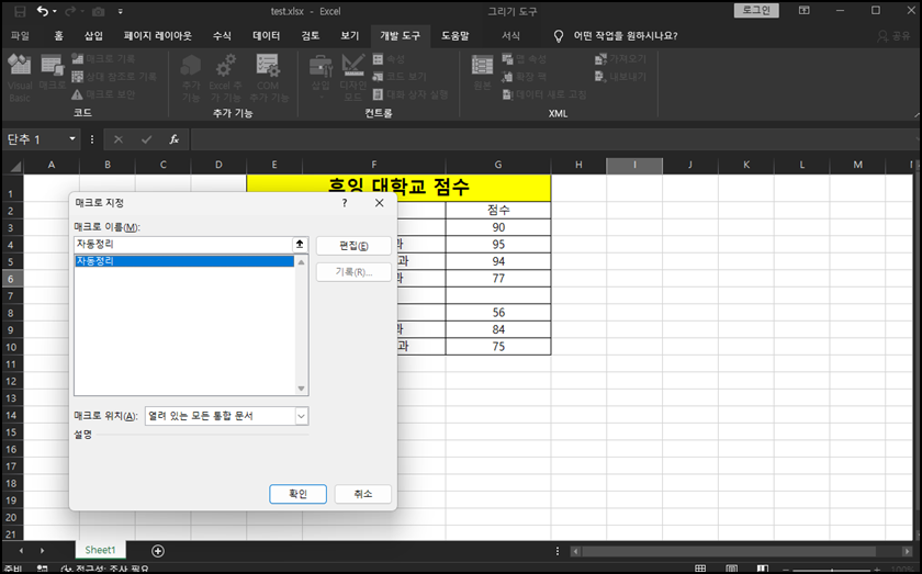 매크로 지정창이 뜨면 자동정리를 클릭 후 확인버튼을 클릭해 주세요.