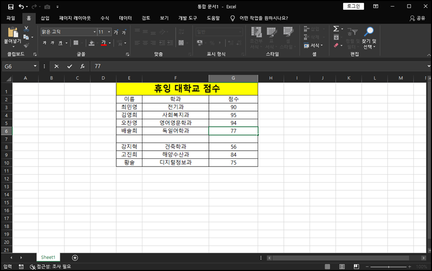 자 이제 위와 같은 엑셀 데이터가 있다고 가정해 볼게요. 여기서 정리를 빈셀을 제거하고, 중복제거, 점수기준 내림차순 정렬 등을 적용해보려고 해요.