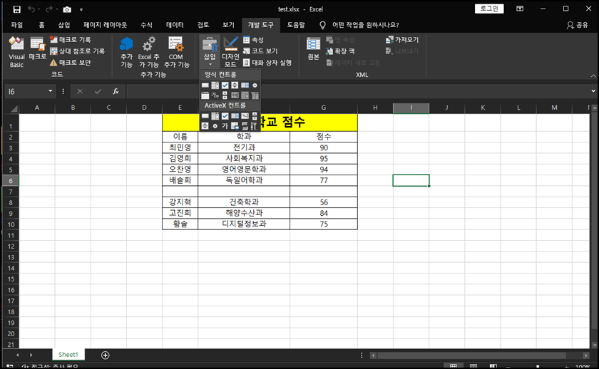 이제 엑셀 상단탭에서 개발도구 -> 삽입 -> 컨트롤 선택 후 시트에 드래그하여 삽입해 주세요.