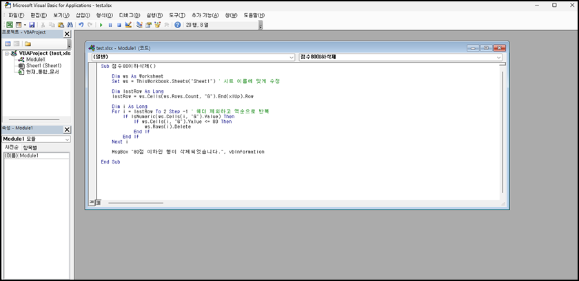 해당 코드는 G열(점수 열)에 숫자가 있고 80점 미만일 경우 해당 행을 삭제하는 코드예요