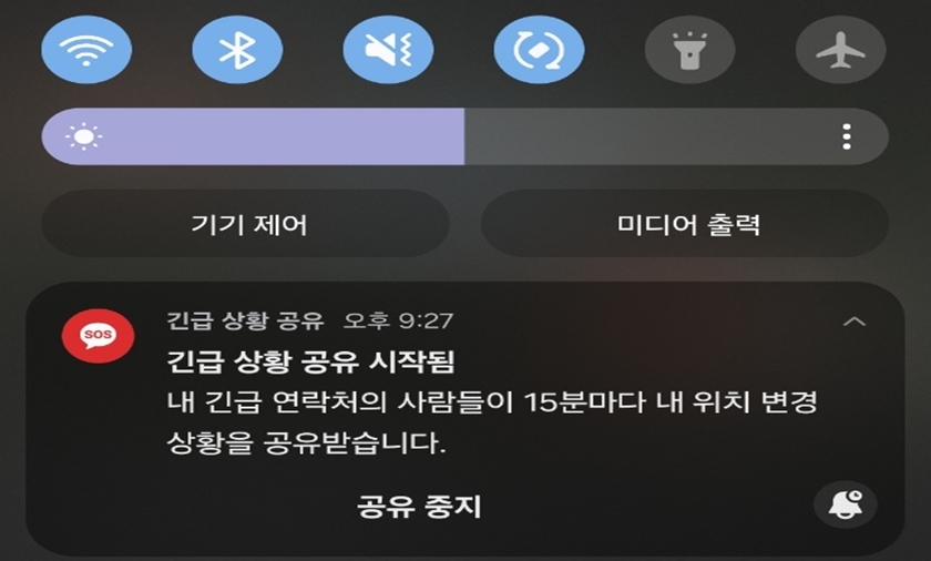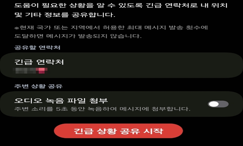만약 "긴급 상황 공유 시작"기능을 활성화하면 긴급 연락처로 내 위치 및 기타 정보 공유도 가능해요.