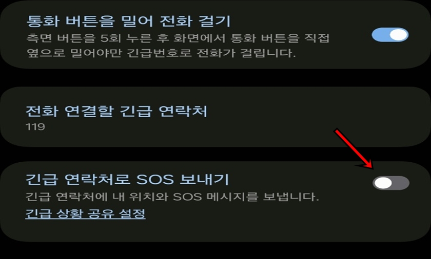 위 사진처럼 "긴급 연락처로 SOS 보내기"가 비활성화되어 있을 텐데, 클릭하여 활성화해 주세요.