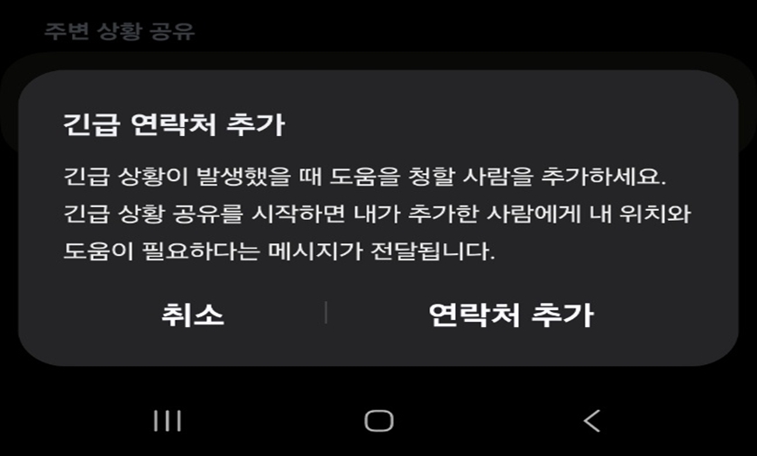 위 시전처럼 "긴급 연락처 추가"창이 뜰 텐데 "연락처 추가"를 클릭해 주세요.