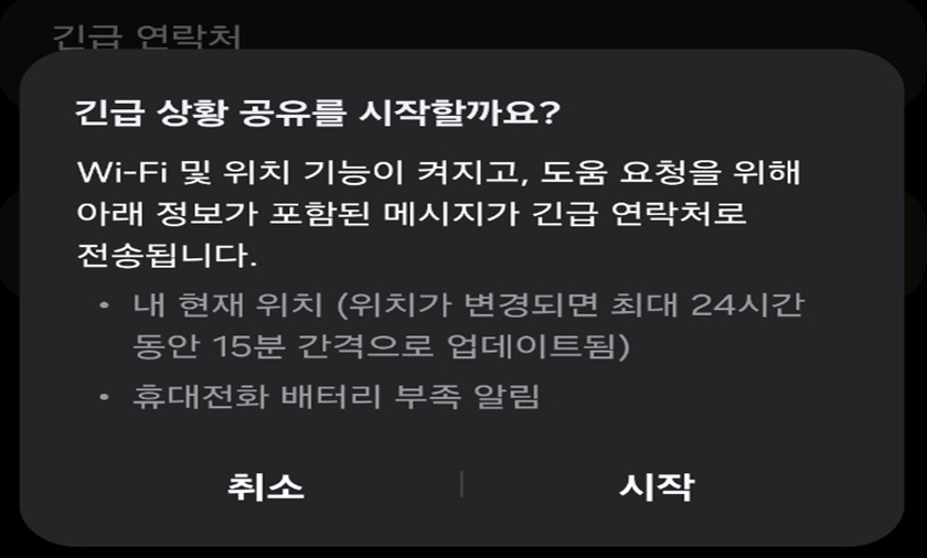 긴급 상황 공유를 시작할까요?라고 메시지가 나오면 "시작" 버튼을 클릭해 주세요.