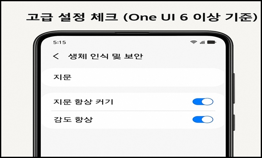 추가 팁으로 One UI 6 이상을 사용 중이시라면, 지문 인식 성능을 높이기 위한 고급설정도 확인해 보세요. 설정 -> 생체 인식 및 보안 -> 지문 항목에서 지문 항상 켜기 옵션을 활성화하면 꺼진 화면에서도 바로 지문 인식이 가능해요. 감도 향상 옵션을 켜면 보호 필름이 있는 상태에서도 인식률 높아져요.