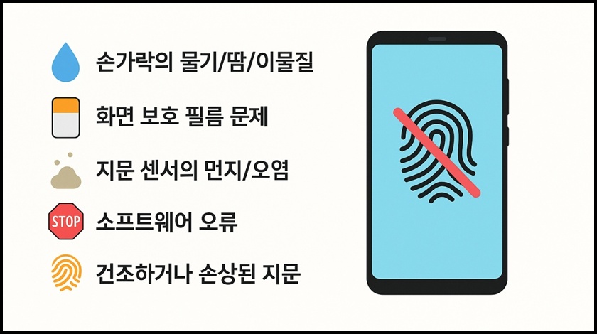 갤럭시 스마트폰의 지문이 잘 인식 되지 않은 이유는 다양해요. 대표적인 원인으로 손가락의 물기/땀/이물질이나 화면 보호필름이나 강화유리의 품질의 문제가 생겼을 겨우, 또는 지문센서의 먼지나 오염, 나아가 소프트웨어 오류 또는 업데이트 후 버그까지 다양한 원인이 있어요.