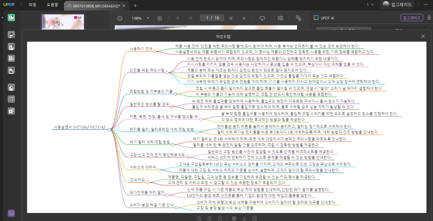 문서를 시각적으로 정리하는데 어려움을 겪으셨다면, 이 기능이 정말 반가우실 거예요. UPDF는 문서 내용을 자동으로 마인드맵 형태로 정리해 주는데, 예를 들어 기획안이나 전략 보고서를 열어두면, 핵심 키워드를 중심으로 주제와 관련 개념들이 가지처럼 정리가 돼요. 학습자료 요약, 발표자료, 팀원 공유 등 다양한 활용이 가능해요.