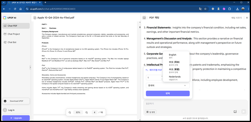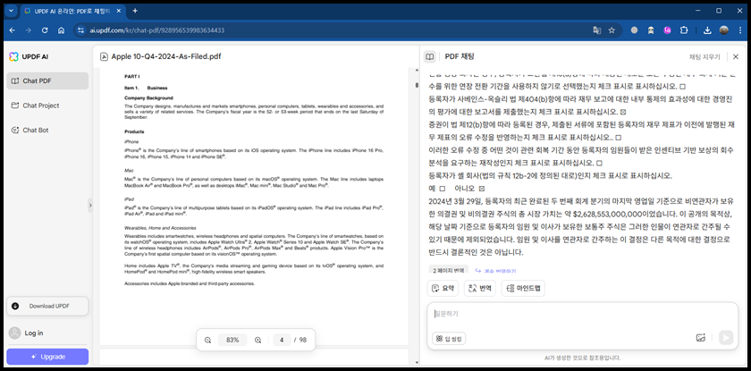 또한 UPDF의 AI 채팅 기능은 기존 PDF뷰어에서는 보기 어려운 혁신적인 요소에요. 특히 "설치된 앱 내"에서만 가능한 기능이 아니라, 웹에서도 바로 실행할수 있다는 점이 매우 강력해요. 예를 들어 외부 출장중 노트북 없이 태블릿이나 공유된 PC만 있거나, 회사 보안상 프로그램 설치가 제한되어 있는 환경에서 UPDF 웹 버전 접속 후, 온라인으로 바로 PDF를 열고 AI에게 질문을 던지면 즉시, 요약, 설명, 번역등의 결과를 받을수도 있어요. 예시로 저는 해외 보고서를 급히 해석해야 했던적이 있는데, 로컬 PC가 아닌 공용 PC에서 UPDF웹에 접속해 PDF를 열고 AI에게 질의하여 단 10초만에 정리된 핵심 요약 파일을 얻을수 있었어요.