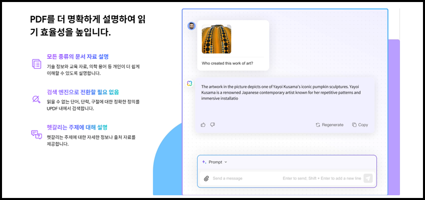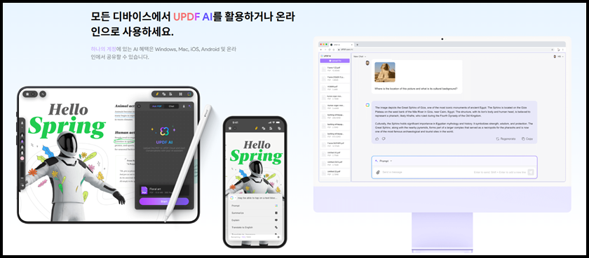 PDF안에 그래프나 도표가 포함돼 있을대, 무슨 내용인지 해석이 어려운 경우가 많죠? 특히 숫자가 많거나 복잡한 인포그래픽은 더더욱 그래요. UPDF는 이미지를 AI가 인식하고, 사용자가 "이 그래프에서 말하는 요점이 뭐야?"라고 물으면 그림의 의미나 데이터까지 해석이 가능해요. 시각 중심의 자료를 다루는 마케터, 디자이너, 기획자에게도 유용한 기능이에요.