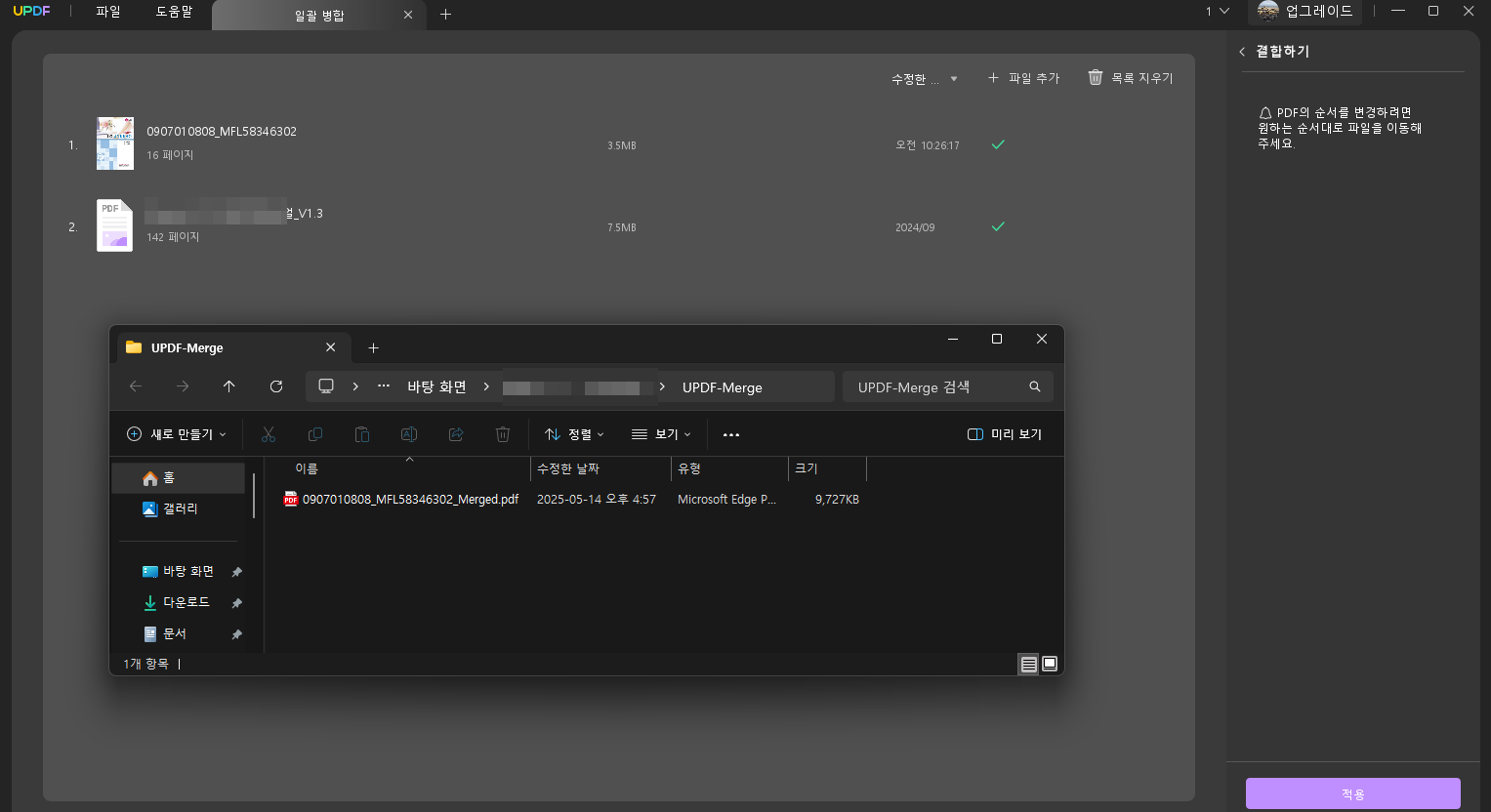 다음은 여러 PDF파일을 하나의 PDF파일로 정리를 테스트해봤어요. 업무나 과제 제출시 여러개의 PDF파일을 하나로 합쳐야 할 때 UPDF의 병합 기능이 정말 요긴하게 쓰이는데요. 특히 UI가 직관적이라 초보자도 쉽게 사용할수 있고 Drag & Drop방식으로 순서를 조정할수 있어 더욱 편리해요. 간단하게 병합하기 기능을 테스트 해볼게요.