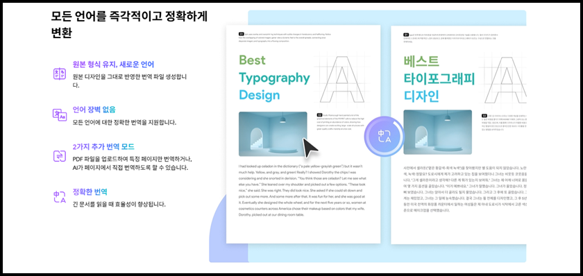 외국에서 온 자료를 번역하려면 복사-> 붙여 넣기 , 번역기 돌리기, 문맥 맞추기까지 번거로운 작업이 예상돼요. 하지만 UPDF는 문서 내 텍스트를 자동으로 실시간 번역해 줘요. 선택한 문단만 번역하거나 전체 문서를 한 번에 번역할 수도 있어요. 특히 기술 문서나 공식 문서도 자연 스러 원 문맥으로 번역되기 때문에 전문적인 작업에도 충분히 활용이 가능해요.