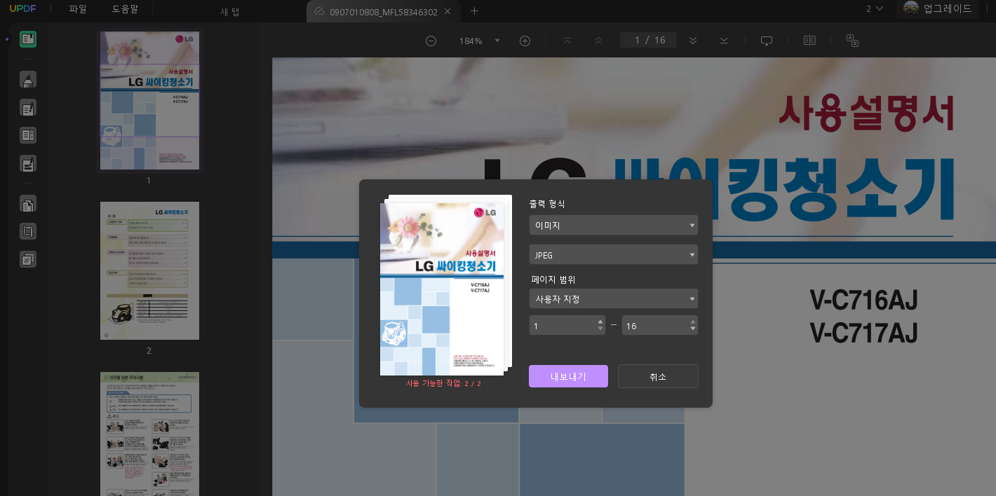 UPDF는 다양한 문서 형식 간의 파일 포맷 변환 기능을 제공하고 있어요. PDF파일을 Word, Excel, PPT 이미지 파일로 변환이 가능한데, 변환속도고 빠르고 글꼴이나 서식이 깨지지 않는 점이 인상 깊었어요. 타 PDF 변환기에서는 가끔 포맷이 망가지는 경우가 있는데 UPDF는 변환 퀄리 면에서도 높은 수전을 보여줬어요. 위 사진은 실제로 PDF문서를 이미지 파일로 변환하는 화면이에요.