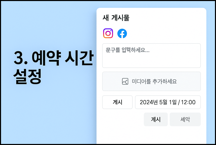 콘텐츠 페이지에 들어가면 오른쪽 상단의 "+ 만들기" 버튼을 통해 새 게시물을 작성할 수 있어요. 이때 게시할 플랫폼을 인스타그램 또는 페이스북 중 선택할 수 있고 돌다 동시에 선택도 가능해요. 게시물에는 사진이나 동영상을 첨부하고, 텍스트 내용과 해시태그, 위치 등을 입력할 수 있어요. 일반적인 인스타그램 게시물 작성과 거의 동일한 방식으로 입력이 가능해 어렵지 않아요.3. 예약 시간 설정