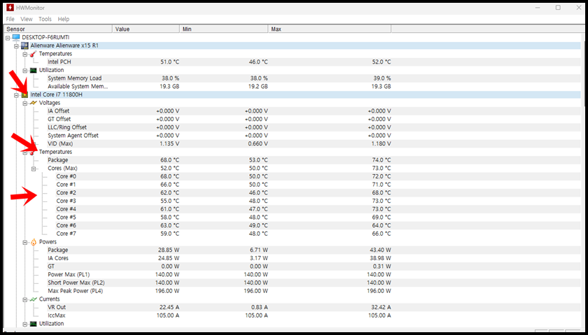 프로그램 실행 화면이에요. CPU항목을 열어보면 CPU코어별 온도가 나열되어 있어요. Value(현재 온도) / Min(최저 온도) / Max(최고 온도) 항목으로 구분돼 있어 지금 현재 온도가 얼마나 되는지 혹은 가장 높았을 때는 몇 도였는지 바로 확인이 가능해요.