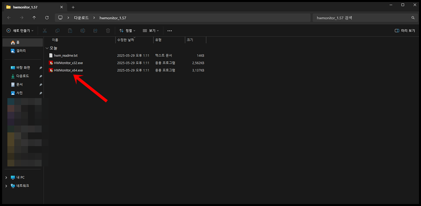 압축을 푼 뒤 HWMonitor_x64.exe 파일을 실행하면 바로 프로그램이 열리며 복잡한 설치 과정 없이 바로 사용할 수 있어요.