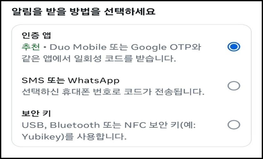 인증 방법을 선택해야 하는데, 인증 앱으로 진행해 보도록 할게요.