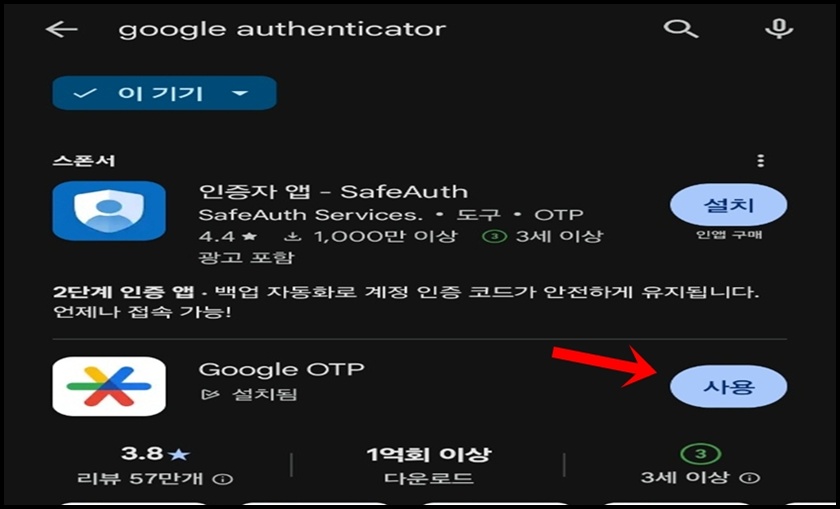 구글스토에서에서 "Google Authenticator"을 설치 후 실행해 주세요. 실행되면 이름은 아무거나 적어주시고 복사했던 코드를 입력하시면 6 자리로 된 코드를 받을 수 있어요.