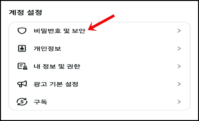 "비밀 번호 및 보안'메뉴로 들어가 주세요.