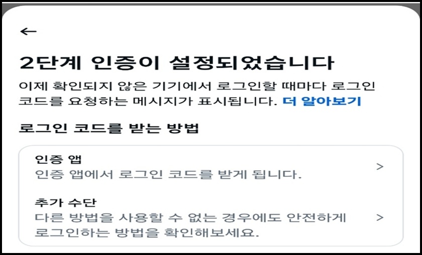 다시 설정에서 2단계 인증메뉴에 들어가 보시면 위 사진처럼 "2단계 인증이 설정되었습니다"라는 문구를 확인할 수 있어요. 이제 확인되지 않은 기기에서 로그인할 때마다 로그인 코드를 요청하는 메시지가 표시가 돼요.