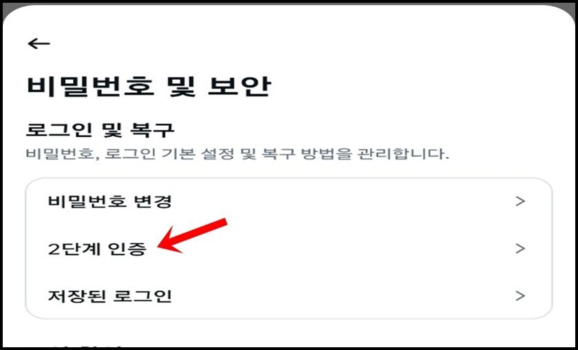 비밀번호 및 보안 메뉴에 들어오시면 위 사진처럼 "2단계 인증"메뉴가 보일 텐데 클릭해 주세요.