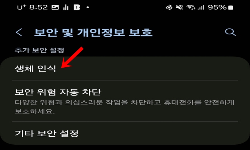 다음은 "생체 인식"메뉴로 들어가 주세요.