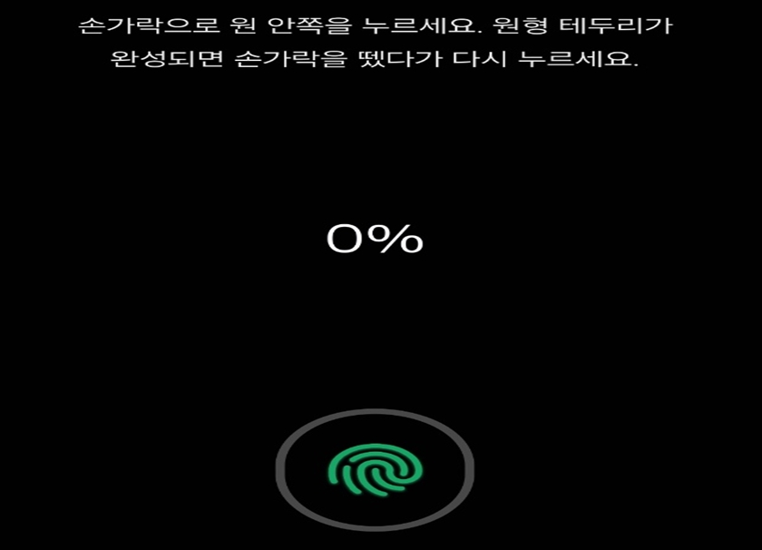 이제 여러분이 등록하고 싶은 손가락을 원형 테두리 안에 손가락을 뗐다가 다시 눌렀다가를 반복해 주세요.