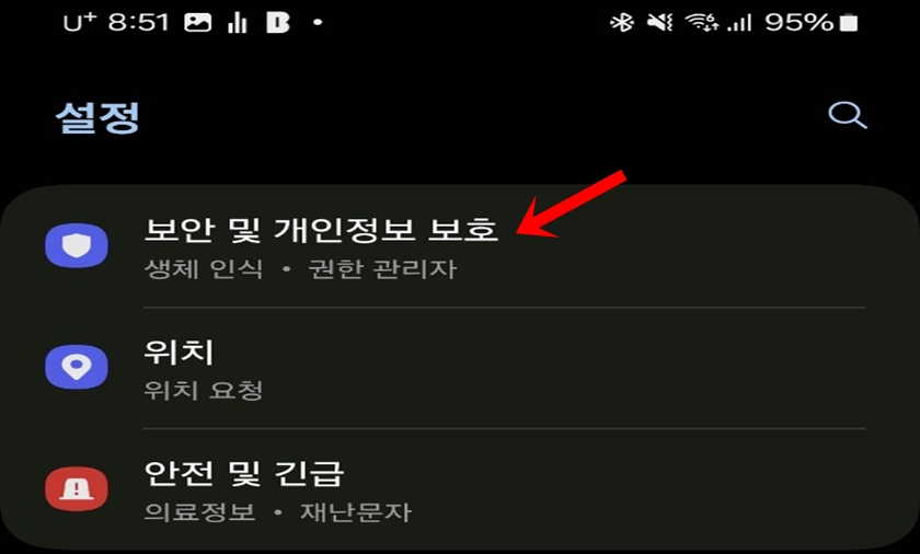 설정메뉴로 들어오시면 "보안 및 개인정보 보호"메뉴로 들어가 주세요.