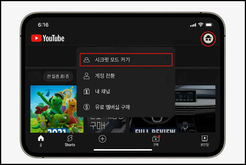 얼마전, 친구에게 강아지 웃긴 영상을 하나 보여주려고 유튜브를 켰다가 며칠 내내 강아지 관련 추천 영상만 쏟아졌던 적이 있어요. 이럴 땐 "시크릿 모드"기능을 사용하는 게 가장 편리한데요. 유튜브 앱에서 프로필 아이콘을 눌러보면 "시크릿 모드 켜기"라는 메뉴가 보이는데, 이걸 활성화하면 시청기록과 검색기록이 일정 저장되지 않아요.